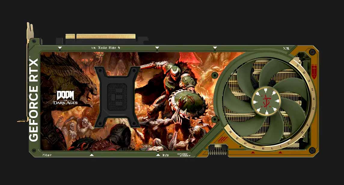 El modelo comparte especificaciones y estructura con la versión estándar —incluyendo un enorme diseño de 3.8 ranuras y cuatro ventiladores—, pero cambia su apariencia por un esquema de colores verde oscuro y dorado, con detalles gráficos de DOOM y logotipos personalizados. Como detalle único, dos de sus ventiladores están pintados de verde en alusión a la nueva arma Shield Saw, mientras que el disipador ha sido dorado para reforzar el estilo visual del título.