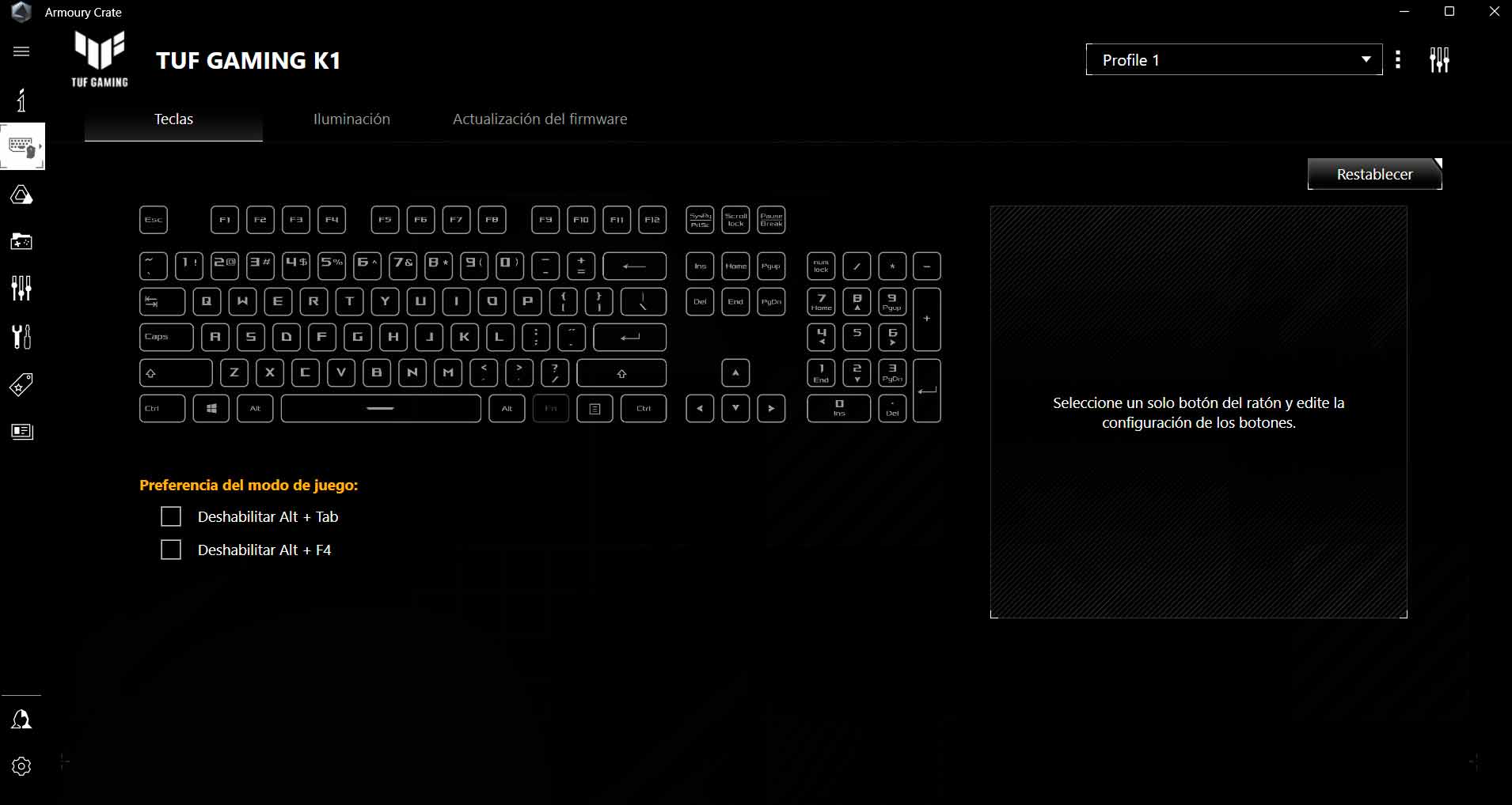 En cuanto al rendimiento, el teclado ASUS TUF Gaming K1 no tiene mucho que destacar, ya que es un teclado de membrana y, por lo tanto, no ofrece el clic característico de los teclados mecánicos; simplemente funciona como cualquier otro teclado de mecánica-membrana.