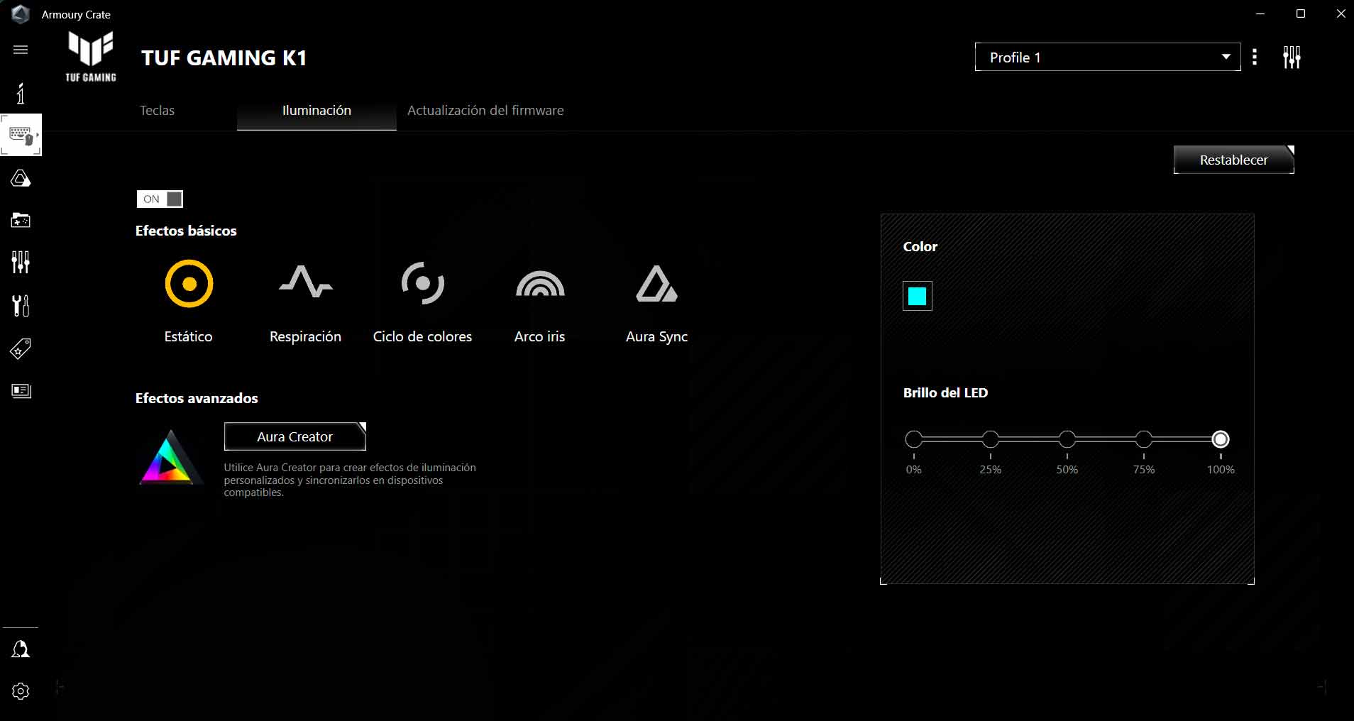 El RGB está bien, aunque las teclas no tienen retroiluminación individual, lo cual es común en teclados de menos de R1000. El RGB es de tipo regional, con una fuga de luz notable. Si no se usa el software ASUS Armoury Crate para personalizar el RGB, se pueden elegir algunas configuraciones predefinidas como estático, respiración, ciclo de colores y arco iris.