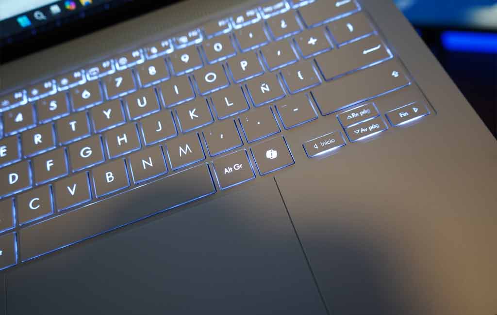 Asus claramente quiso impresionar con la Zenbook S14 OLED, y eso se nota en el diseño premium de su teclado y touchpad. Las teclas tienen una textura agradablemente suave que resulta bastante atractiva. Escribir en este teclado es una experiencia placentera, en gran parte gracias a la rigidez y densidad de la carcasa inferior, que elimina esa sensación hueca típica de algunos teclados de laptops. Sin embargo, aquí es donde aparece un «pero».