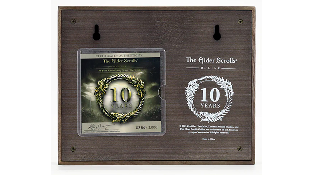 El artículo consiste en una pieza única del blade original, enmarcada junto a una placa conmemorativa que celebra los diez años del MMORPG de Bethesda.