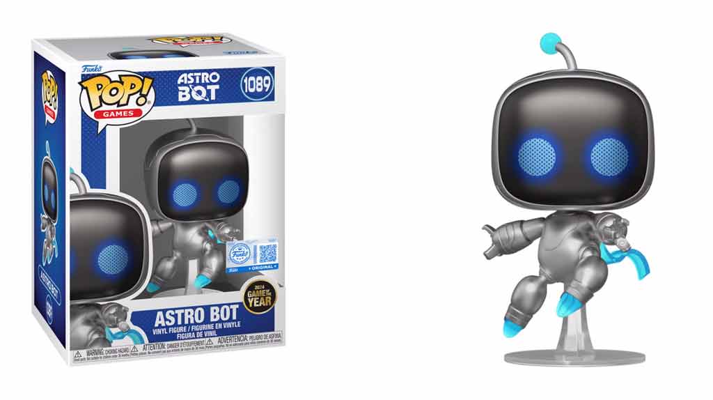 Astro Bot finalmente se convierte en Funko Pop, con un acabado plateado y el distintivo GOTY. El Pop tiene los propulsores activados y está montado en una base transparente que da la ilusión de que está flotando unos centímetros sobre el suelo.