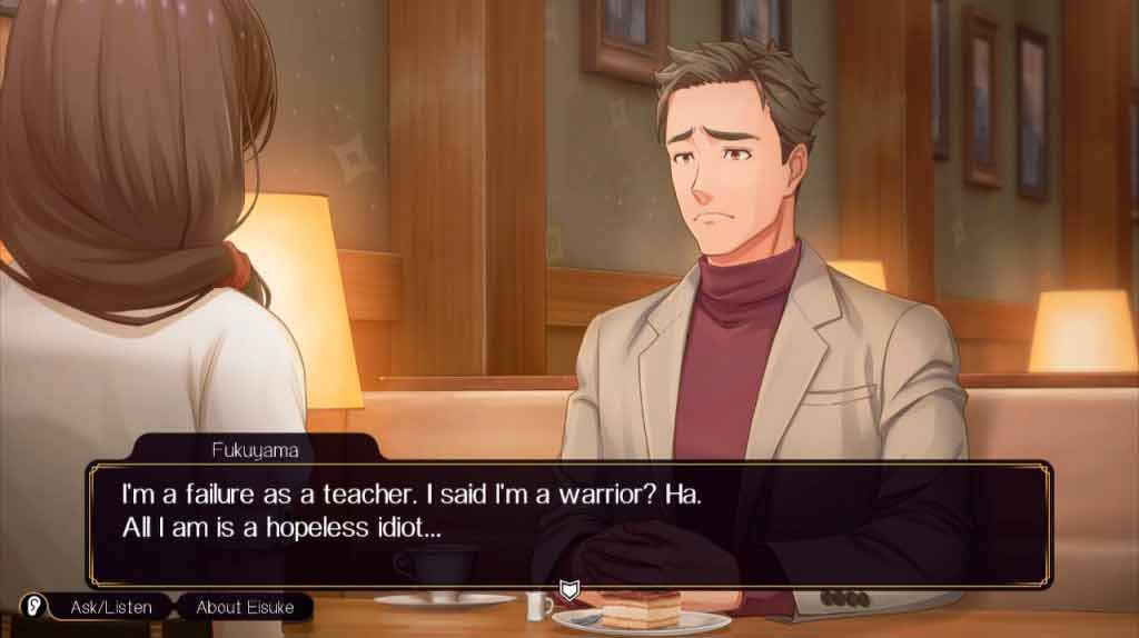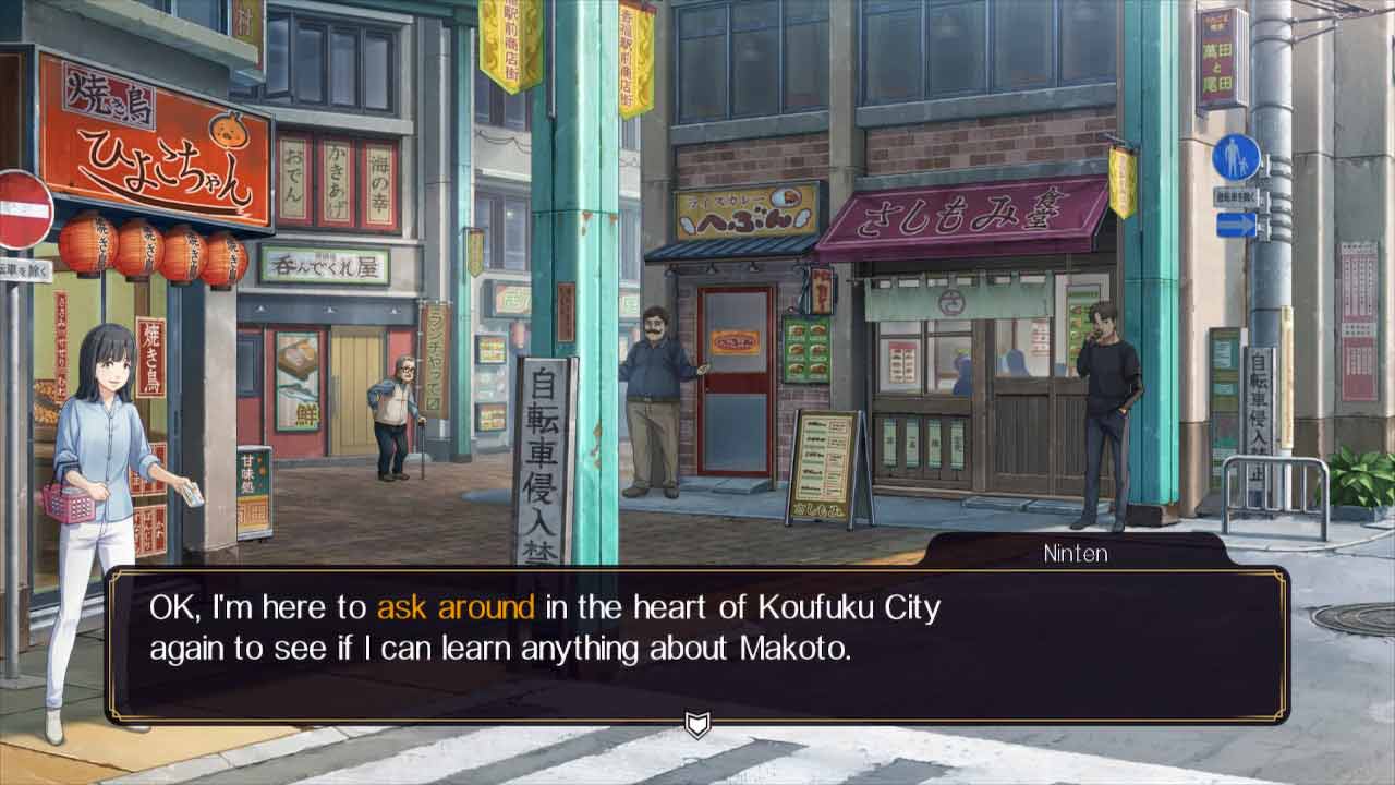 Todos los capítulos, excepto el final, hacen un gran trabajo revelando nuevas pistas y personajes mientras resuelven algunos de los misterios a lo largo del camino, lo que te hace sentir que estás avanzando de verdad en el caso. El ritmo puede parecer lento, pero esto hace que las pocas escenas de acción rápida se destaquen aún más como dramáticas. De vez en cuando, el juego te pedirá que respondas algunas preguntas para evaluar tu comprensión del caso, lo cual es una excelente manera de reiterar los aspectos importantes que aprendiste en el capítulo. Además, cuenta con personajes creíbles con suficientes motivaciones ocultas para hacerte examinar cada personaje secundario que encuentras, preguntándote si podrían estar involucrados. ¿Es el hermano desaparecido? ¿El maestro extrañamente apasionado? ¿Quizás el detective policial excesivamente familiar? Lo triste es que siento que una configuración tan bien elaborada merecía un mejor desenlace. Emio – The Smiling Man coloca todas las piezas de manera realista y fundamentada, pero luego no te permite desarmarlas en el último minuto.