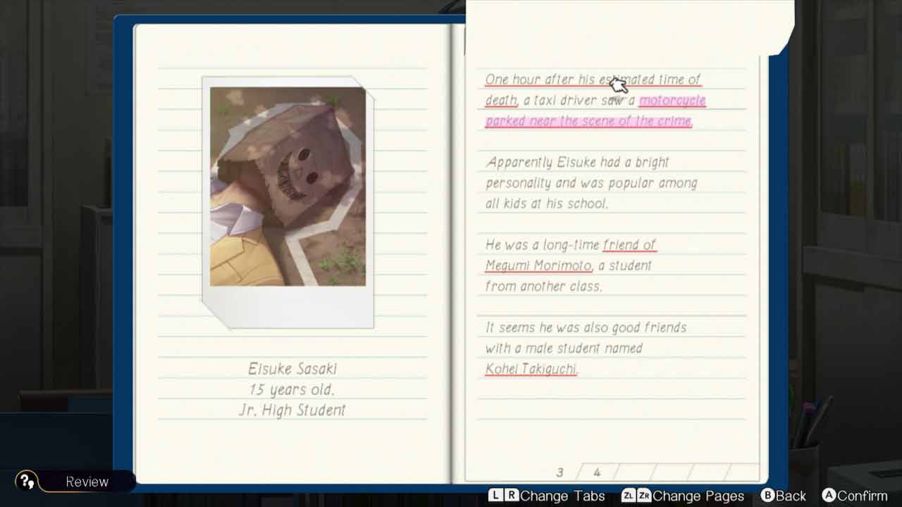 El nuevo caso para el equipo de Famicom trata sobre un escolar estrangulado cuyo asesinato parece coincidir con el modus operandi de un asesino en serie de hace 18 años. Para hacerlo aún más interesante, los homicidios tienen similitudes con una leyenda urbana local del “Hombre Sonriente”, una espeluznante historia sobre un hombre que lleva una bolsa de papel con una sonrisa dibujada. Esta premisa tiene una vibra ligeramente derivativa —el concepto del “Hombre Sonriente” evoca instantáneamente cada mala película de terror de los últimos diez años—, pero creo firmemente que una historia bien escrita puede hacer funcionar cualquier cosa, y no soy inmune a una buena leyenda urbana.