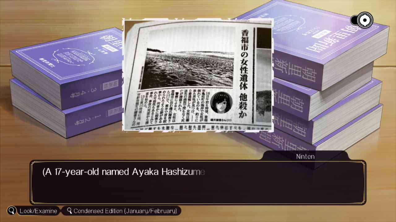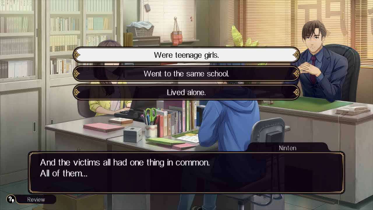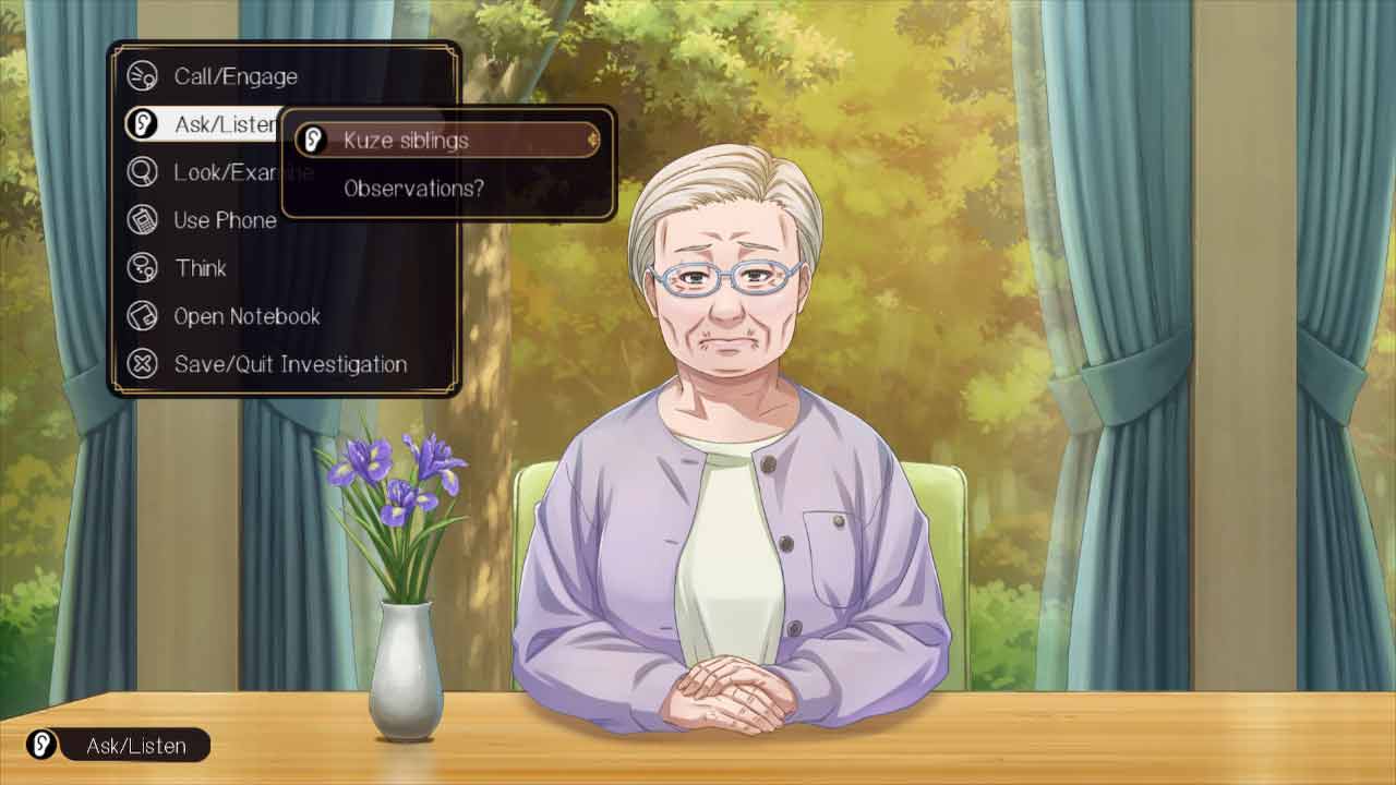 Aunque no voy a revelar detalles, tu presencia en el capítulo final es sorprendentemente ornamental. Es un clímax impulsado enteramente por otros personajes, y nada habría cambiado si no hubieras investigado nada en absoluto. Esto fue bastante inesperado dado lo competente que había sido el juego hasta ese momento. Luego, cuando todo termina, Mr. Utsuji aparece para exponer todas las pistas que encontró mientras estaba fuera de pantalla. A diferencia del ritmo lento y cuidadoso del resto del juego, que te pone al mando para encontrar todas las pistas, solo obtendrás una viñeta de Mr. Utsuji recibiendo toda la información de fondo y las motivaciones de los personajes que nos faltaron. El juego probablemente buscaba una catarsis emocional, pero el final cargado de exposiciones hizo que me resultara más difícil apreciarlo. Dicho esto, tomando la historia en su conjunto, sigue siendo un misterio entretenido; simplemente no es el mejor de la serie.