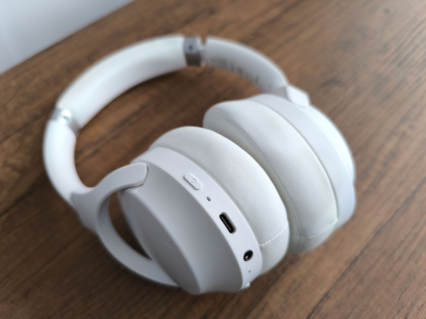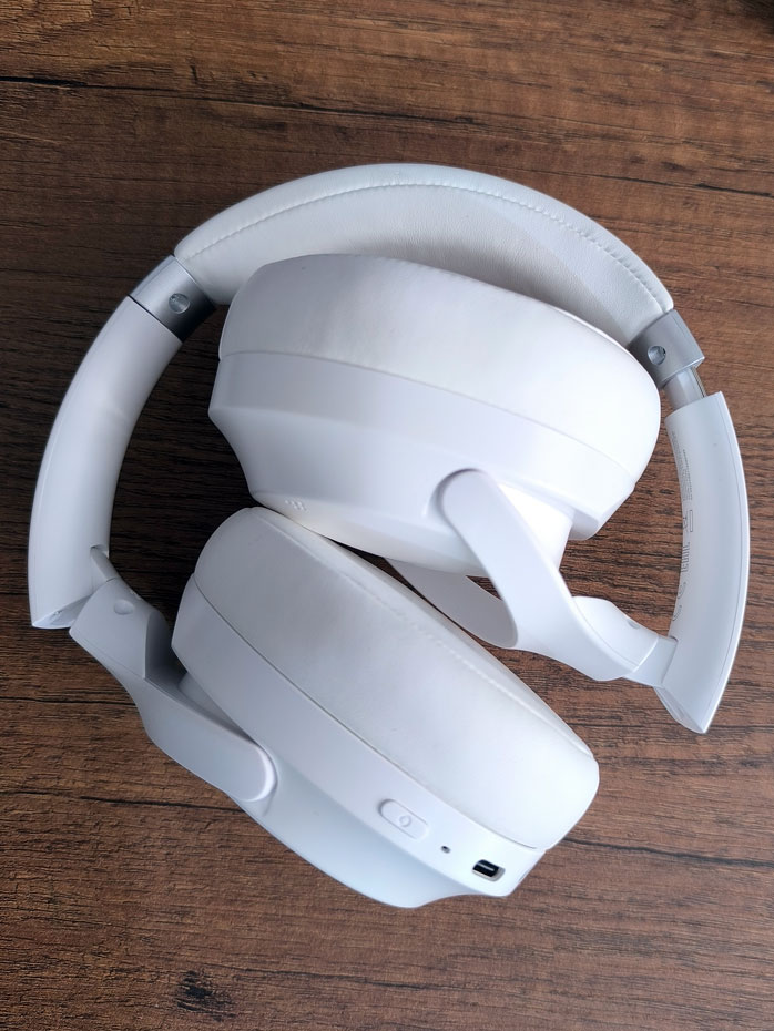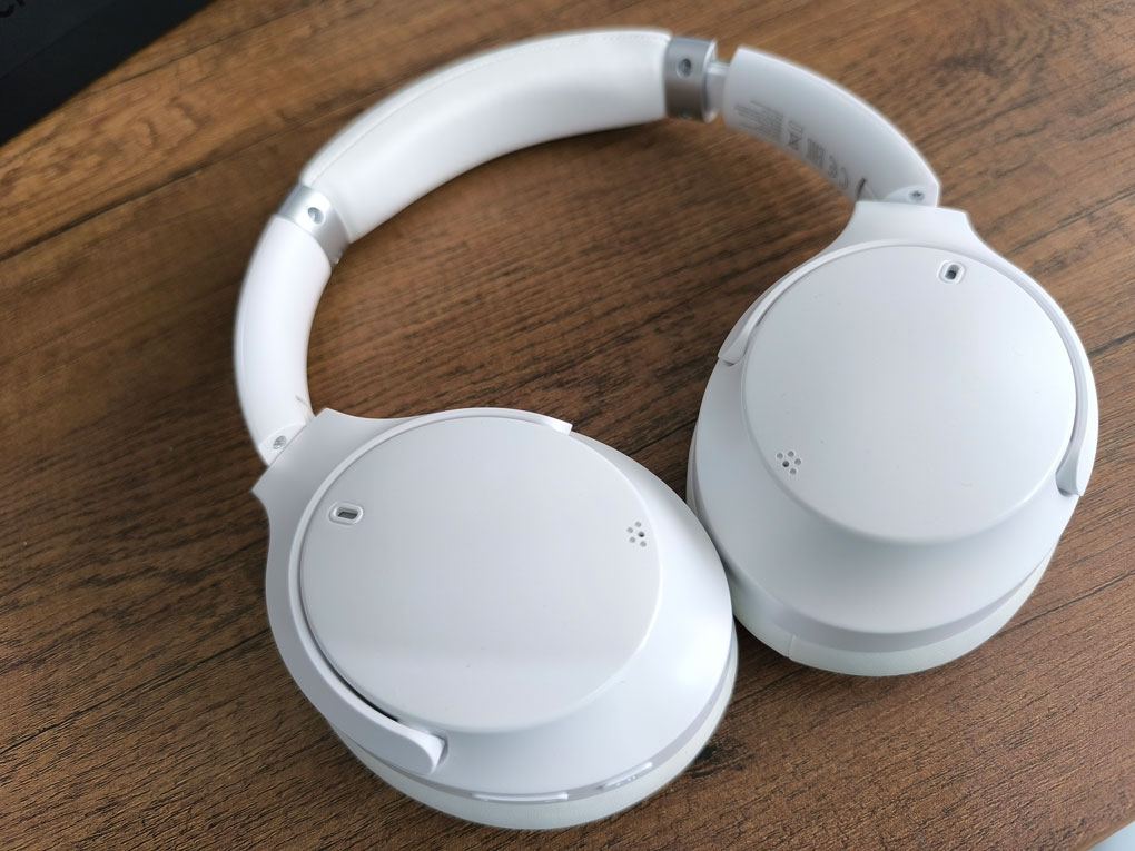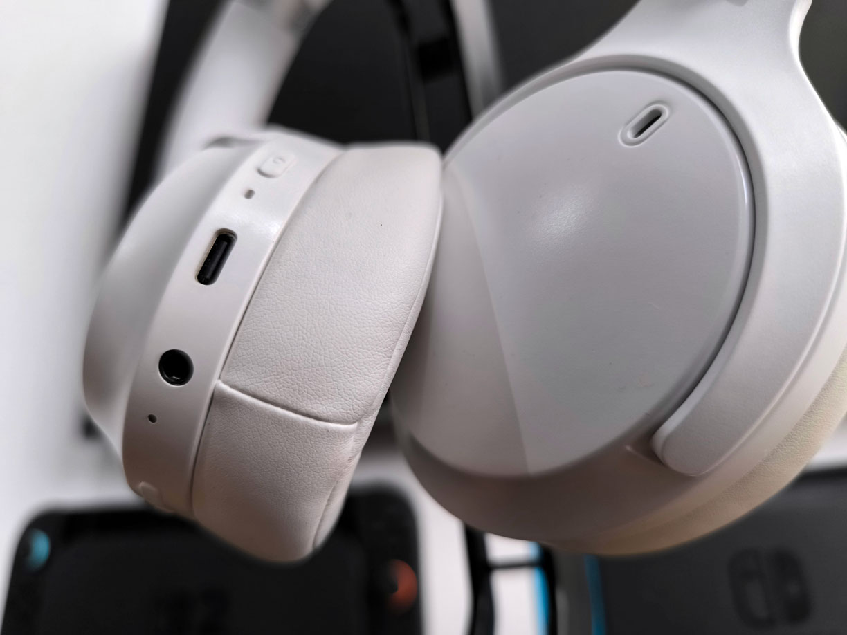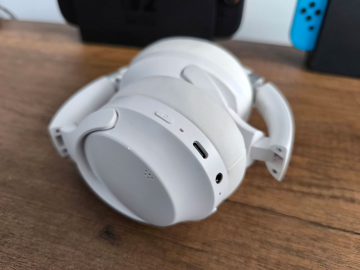 En el auricular derecho se encuentran el puerto de carga USB-C, micrófono, puerto de 3.5 mm, y 4 botones que se reparten de forma bastante simple y fácil las diferentes funcionalidades como subir y bajar el volumen, cambiar la pista, encender/apagar, cambio de modo, potenciar bajos, etc.