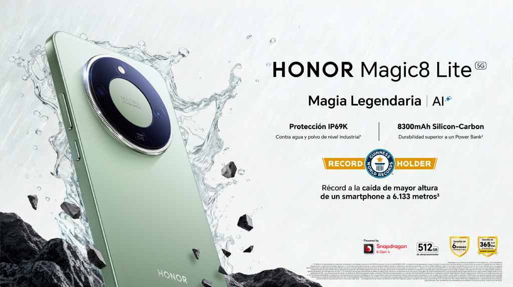 La resistencia del dispositivo no es solo una promesa comercial. El Magic8 Lite consiguió un Récord Guinness al sobrevivir a una caída desde 6,133 metros de altura, logro que refuerza la imagen de HONOR como fabricante de smartphones preparados para condiciones realmente exigentes.