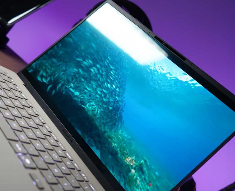El diseño minimalista de la Zenbook A14 incluye una pantalla OLED de 1920×1200 píxeles, con una relación de aspecto 16:10 ideal para productividad. Sin embargo, la tasa de refresco de 60Hz podría haber sido más alta, especialmente cuando se considera que otros modelos de Asus cuentan con pantallas de 120Hz. A pesar de esto, la pantalla ofrece un excelente contraste y una cobertura de color DCI-P3 del 100%, lo que la hace adecuada para ver videos y trabajos visuales básicos. Los altavoces, sin embargo, no ofrecen la mejor calidad de sonido debido a su diseño compacto.