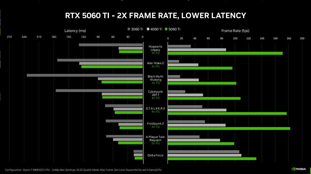 Gracias a la tecnología Multi Frame Generation, NVIDIA asegura un alto rendimiento en juegos con la RTX 5060. Las pruebas se realizaron a 1080p con ajustes gráficos al máximo, usando un procesador AMD Ryzen 7 9800X3D. Los resultados incluyen 234 fps en Hogwarts Legacy, 148 fps en Cyberpunk 2077, 220 fps en Avowed y hasta 330 fps en Marvel Rivals.