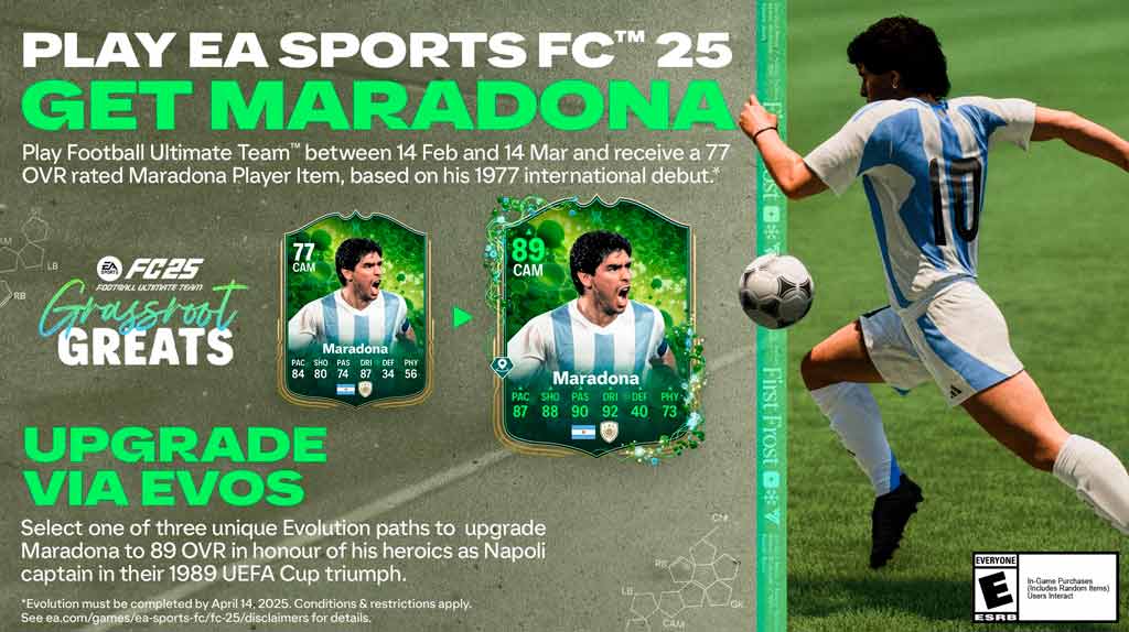 Ahora, Maradona vuelve al título como parte del evento Grassroot Greats, el cual se llevará a cabo durante las próximas dos semanas. Para celebrar su regreso, EA ha decidido regalar una carta especial de Maradona que podrá evolucionar.