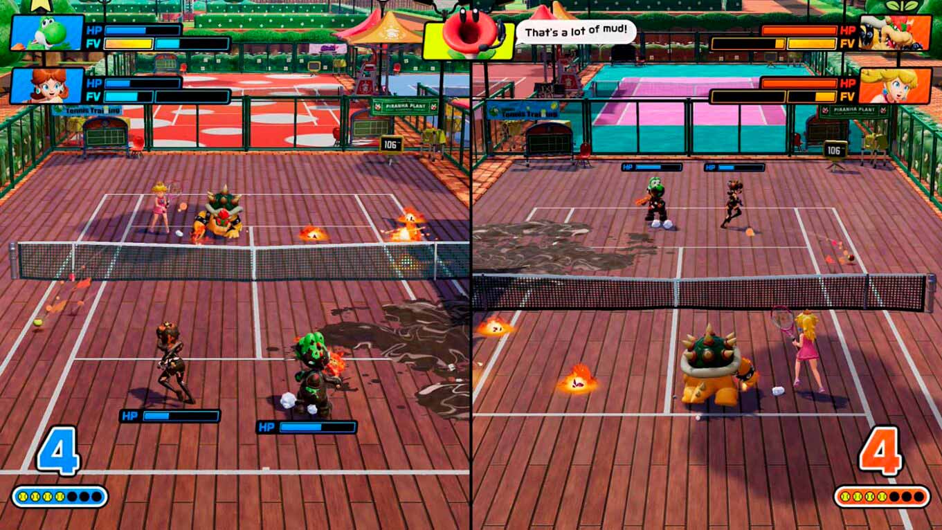 El juego cuenta con un plantel bastante amplio, todos previsiblemente vestidos con pantalones cortos deportivos y gorras. Mario y su grupo están todos presentes, lo que, cada vez más común, incluye sus versiones bebés, Pauline y Rosalina. La selección de “minions” es la mezcla habitual de clásicos como Shy Guys, Koopas y Boos, pero enemigos menos conocidos como Wiggler y Petey Piranha fueron gratas sorpresas. Me gusta que la mayoría de ellos deban desbloquearse, una característica de los juegos de los 90 y 2000 que realmente he extrañado. La lista de logros de Mario Tennis Fever te indica exactamente cómo desbloquear cada cosa, ofreciendo un buen punto medio para quienes no tienen paciencia con los desbloqueables.