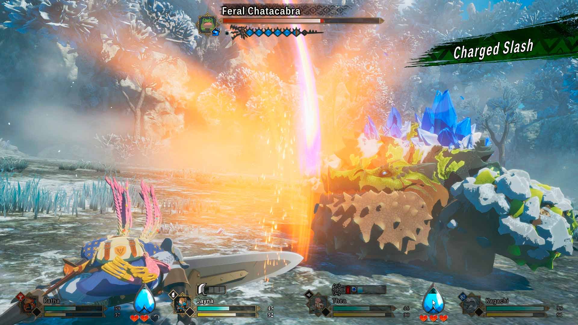 La base del gameplay de Monster Hunter Stories se mantiene bastante intacta: el combate sigue siendo por turnos y se activa al cruzarte con monstruos en el mundo abierto. Los ataques y habilidades se dividen en Power, Technical y Speed, con la clásica relación de piedra-papel-tijera, permitiéndote contrarrestar los movimientos enemigos con ataques del tipo adecuado. Aunque aún depende un poco de la suerte y del “ojo clínico” del jugador para adivinar las preferencias de cada monstruo, después de un par de turnos se puede ir deduciendo de manera confiable.