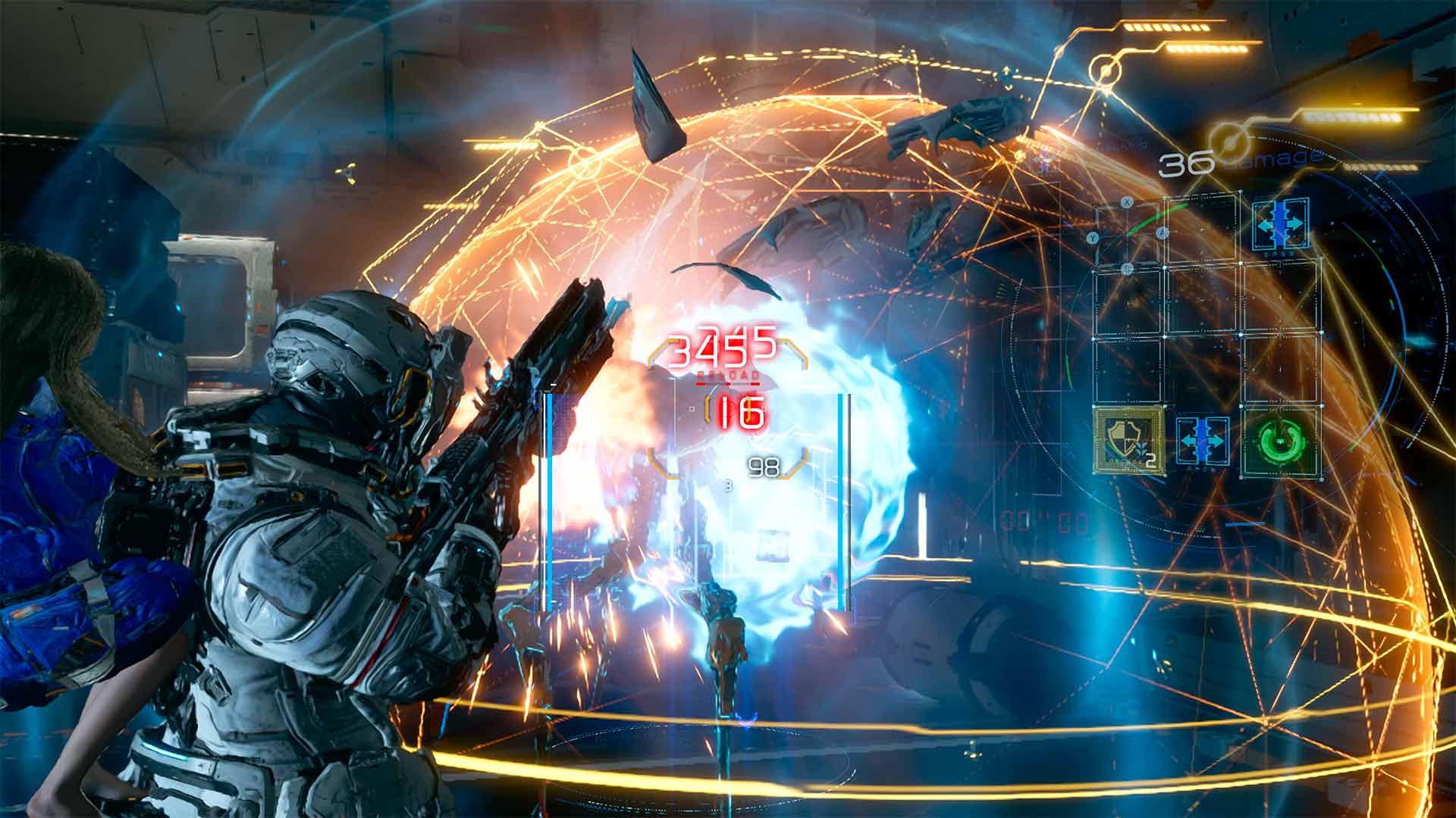 Este sistema del Grid, que aparece tanto al inicio como en pleno combate, es probablemente lo más original del juego. Cambia por completo cómo se sienten los enfrentamientos. No es fácil encontrar otro shooter que haga algo parecido y que además lo ejecute tan bien. El hackeo de Diana no dura para siempre, así que tienes que repetir el proceso varias veces durante una pelea. Puede sonar repetitivo, y de hecho para algunos jugadores era una preocupación, pero el juego sabe mantenerlo interesante. A medida que avanzas, los puzzles se vuelven más complejos, el Grid se expande y empiezas a desbloquear nodos especiales que mejoran el hackeo. No solo tienes que llegar al nodo principal: en el camino puedes activar modificadores que, por ejemplo, sobrecalientan a los enemigos, conectan varios androides para revelar sus puntos débiles al mismo tiempo, los hacen atacarse entre ellos o los dejan aturdidos. Incluso hay configuraciones más ofensivas que permiten hacer daño directo con el hackeo, y eso termina siendo clave.