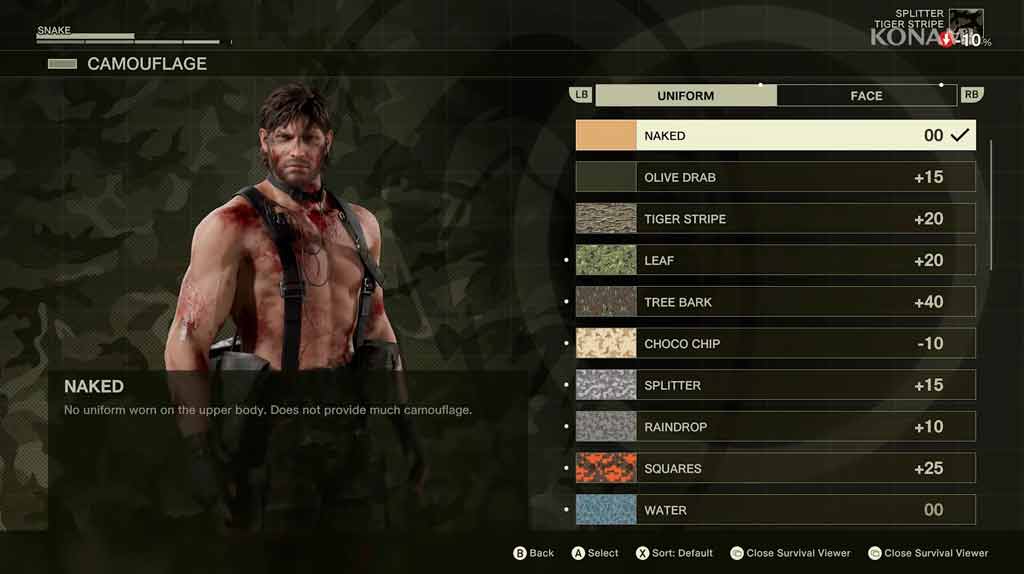 Los jugadores ahora pueden cambiar entre el camuflaje de Uniforme y Rostro presionando L1/LB y R1/RB, en lugar de tener que salir de un menú para seleccionar el otro. Además, se incluye un visor de modelos para examinar las lesiones y detalles del camuflaje de Snake.