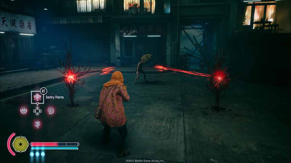 Aprender a dominar cada personaje y sus características es un verdadero placer. Alex, el motociclista, es de los más potentes, ya que usa una espada de sangre para el combate cuerpo a cuerpo y una escopeta recortada también de sangre, ideal para un devastador golpe final. Anita, por su parte, puede invocar a otros humanos, lo que garantiza que tengas cuerpos para cambiar si tu salud baja. De forma astuta, al convocar a estos aliados, puede utilizar la habilidad “Mind Jack” en varios a la vez, quienes en vez de huir, atacarán a los Slitterheads automáticamente, lo cual es crucial en batallas difíciles, permitiéndote atacar a los jefes más fuertes mientras estos quedan paralizados. Estas habilidades se potencian considerablemente si encuentras los fragmentos ocultos en los niveles, los cuales ofrecen puntos de habilidad adicionales además de los obtenidos al completar misiones. Aunque los árboles de habilidades no son profundos, al final te sientes como un verdadero mago de sangre, controlando cuerpos y caos para eliminar cada demonio que se interpone en tu camino.