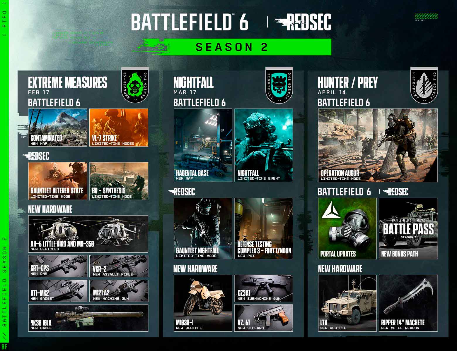 La tercera fase, Hunter / Prey, se lanzará el 14 de abril e incorporará el modo Operation Augur, un nuevo vehículo LTV, un arma cuerpo a cuerpo tipo machete y una actualización para Portal con dos modos verificados adicionales.