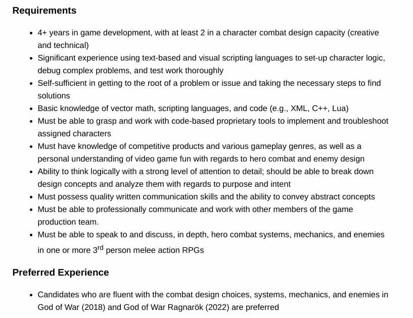 Encontrado en el sitio web de PlayStation, la compañía estaba contratando para el puesto de Diseñador Técnico de Combate Senior en Santa Monica Studio. Por sí solo, esto no significa mucho, ya que PlayStation casi siempre está contratando para una gran cantidad de puestos en sus diversos estudios. Lo que hace que esta lista sea bastante interesante es que enfatiza que los candidatos deben estar “familiarizados con las elecciones de diseño de combate, sistemas, mecánicas y enemigos en God of War (2018) y God of War Ragnarok”. Por lo tanto, esto parece indicar que la posible contratación trabajaría directamente con el equipo de God of War en Santa Monica Studio, probablemente en una nueva entrega de la serie.